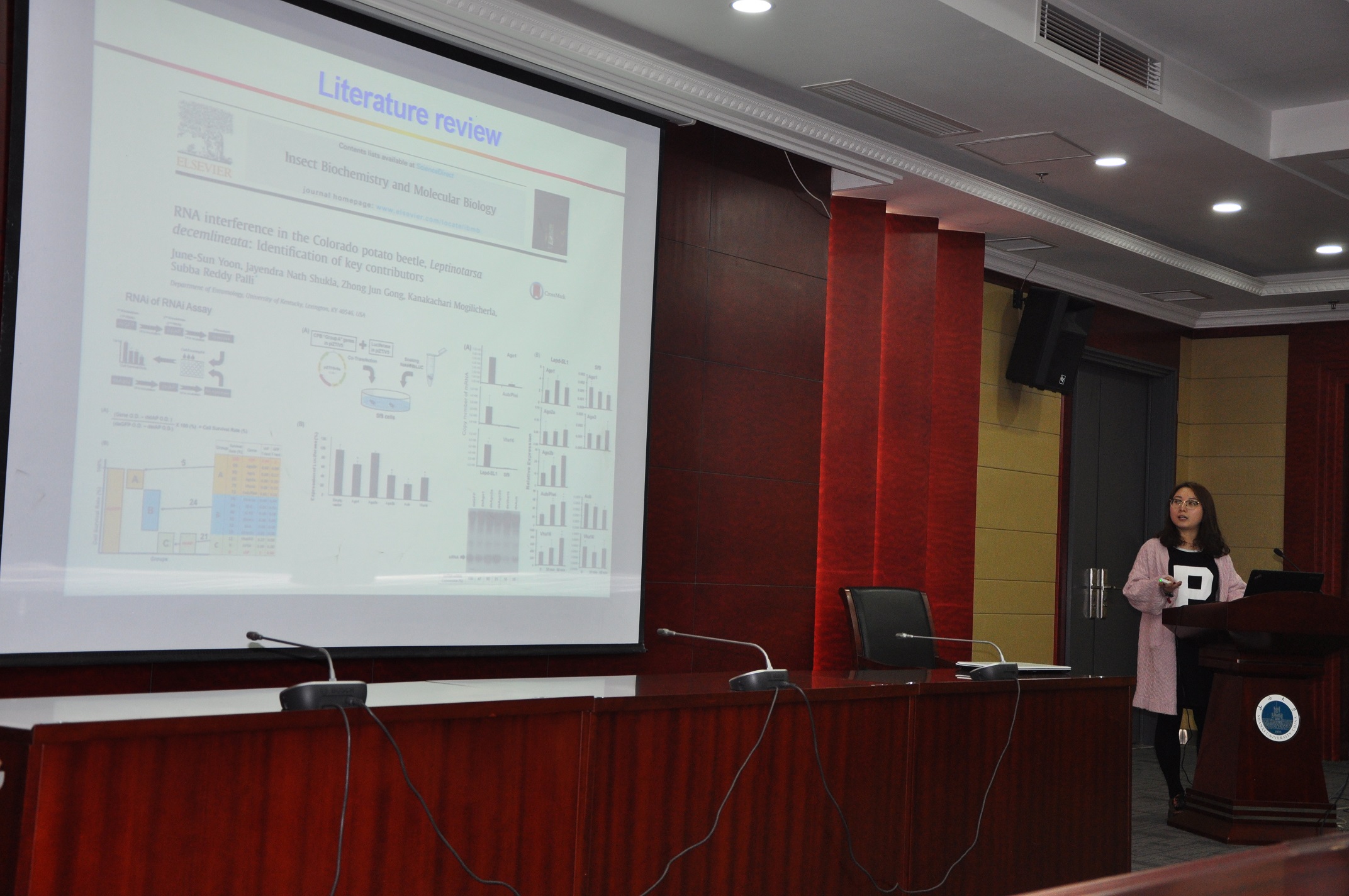首先,杨洋同学介绍了近期实验室内的重要新闻:我所博士生王艳丽和硕士生勾昕的学位论文分别荣获2017年山西省优秀学位论文,标志着我所研究生培养工作取得了新的进步;山西省百人计划特聘教授Bernard Moussian近期抵达太原,对我所进行工作指导,Bernard教授的工作安排十分紧凑,效率很高,与各科研小组的师生进行深入交流讨论,Bernard教授的来访,有力地促进了我所科研工作的进展;近期,2018级硕士研究生前来山西大学参加复试,朝气蓬勃的新一届研究生即将走入科研殿堂,而我所也将迎来一批新生力量的加入。