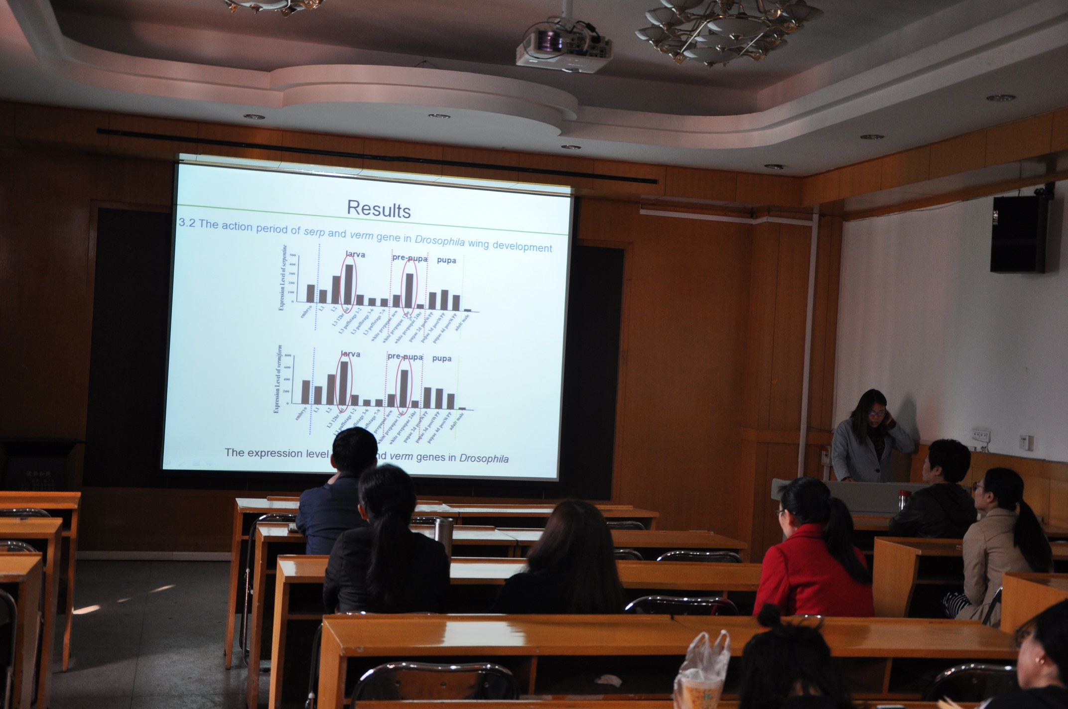 之后,姬亚男和孔悦同学分别就“几丁质脱乙酰基酶serpentine和vermiform基因对果蝇翅发育的影响”和“异位表达Dichaete对果蝇成虫盘发育的影响”的研究背景、实验进展和本学期的工作计划做了汇报。在座师生对两位同学的汇报进行了点评,并提出具体建议,对其下一步的研究工作具有重要的指导意义,也对低年级的同学起到了引导作用。