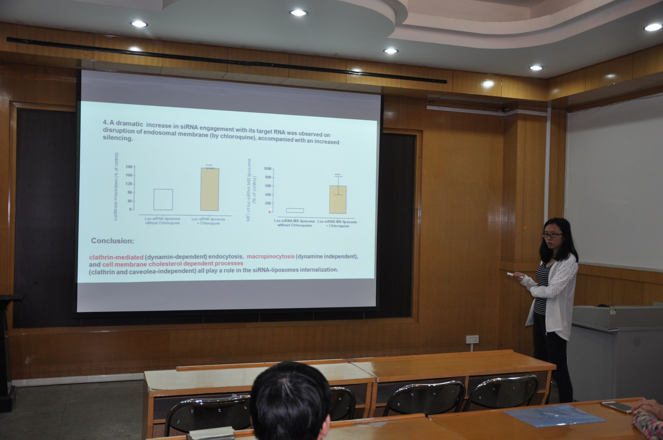 首先,张晶同学介绍了近期实验室内的重要新闻:2018年5月2日,我所成功举办第三次chalk talk研究生学术活动,此次活动中,由博士研究生史学凯讲解了RT-qPCR基本原理、实验过程及注意事项,大家积极参与,气氛轻松,学术氛围浓厚,各位同学收效颇丰;为了给大家营造良好的学习与工作环境,我所对405师生工作室进行了整理,增加了统一型号的书架,使工作室面貌焕然一新;我所也对农科院植保所实验室进行了整理,增加了实验台架,改善了实验条件;2018年5月14日,第一届国际生物防治大会在北京举行,我所李涛老师和Malik博士研究生应邀参加会议,通过参加会议,扩大与同行学者的交流,促进科研工作进展。此外,张晶同学还介绍了近期国内外本领域最新科研进展和发表于国际学术刊物、与本研究所研究内容相关的重要学术论文。