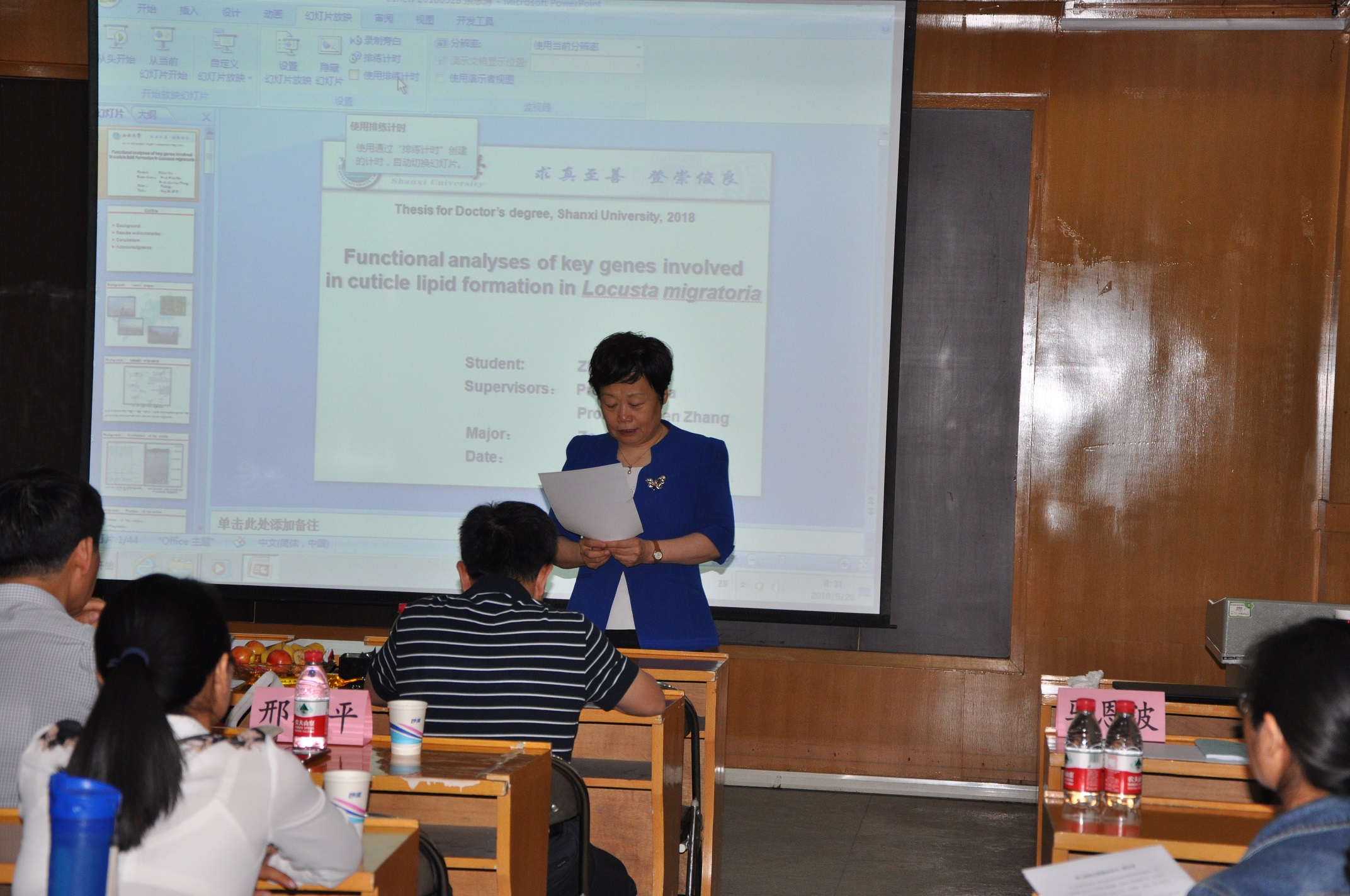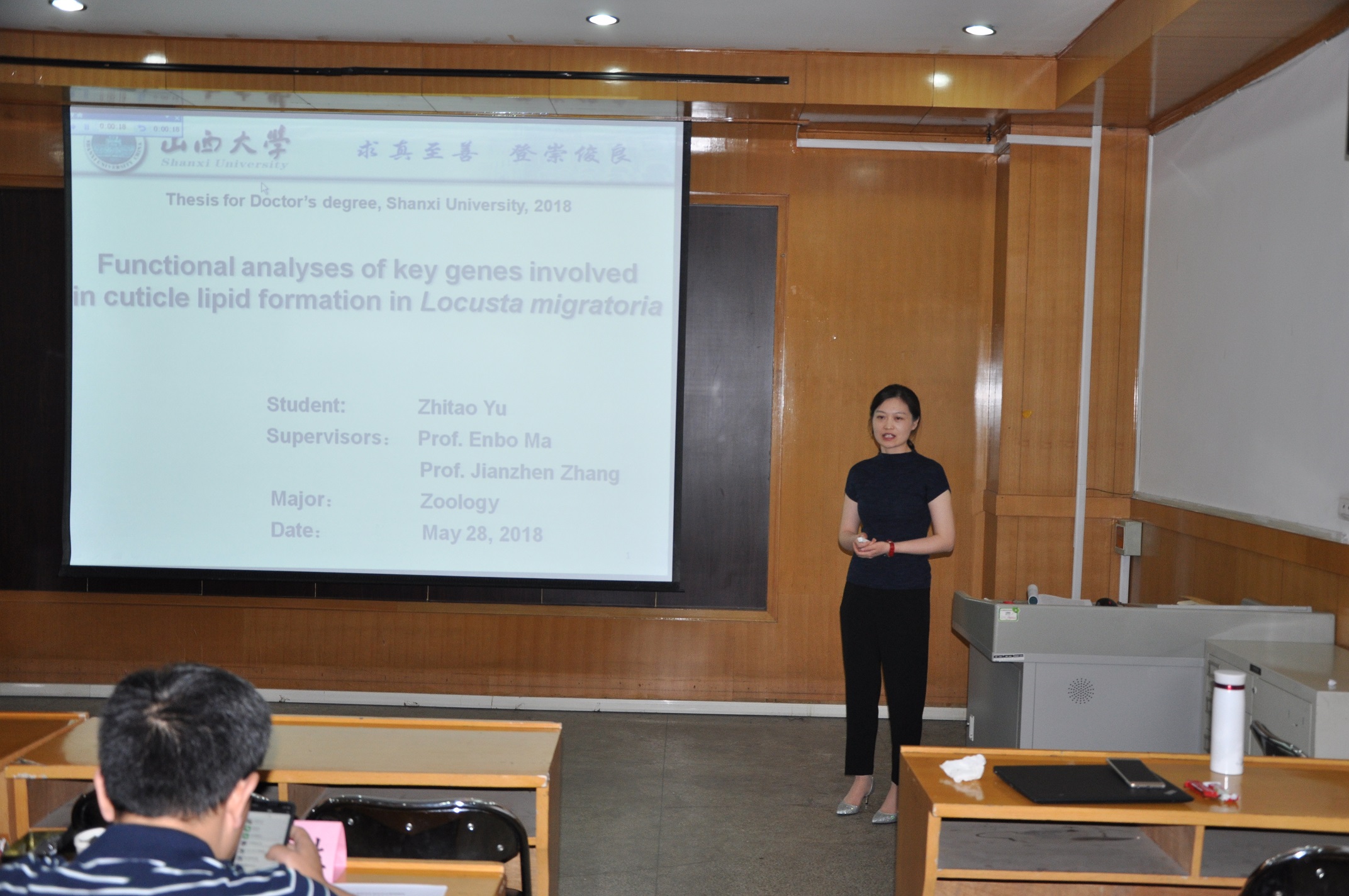 答辩会上,首先由马恩波教授介绍答辩委员会主席及成员,接着,答辩委员会主席李胜教授主持论文答辩各项议程。余志涛博士生作为第一个答辩汇报人,其学位论文题目为“飞蝗表皮脂形成关键基因的功能研究”。接着,6位硕士研究生依次进行了其答辩汇报,这6位硕士研究生分别为:柳伟伟,论文题目“飞蝗表皮发育及几丁质酶5-1在胚胎期的功能研究”、秦忠玉,论文题目“核受体因子HR3和βFTZ-F1在飞蝗表皮和翅发育中的功能研究”、杨亚亭,论文题目“飞蝗内表皮蛋白基因功能研究”、姬亚男,论文题目“几丁质脱乙酰基酶serpentine和vermiform基因对果蝇翅发育的影响”、孔悦,论文题目“异位表达Dichaete对黑腹果蝇成虫盘发育影响机制研究”、康晓林,论文题目“飞蝗和玉米螟中CPR和细胞色素P450基因的功能研究”。